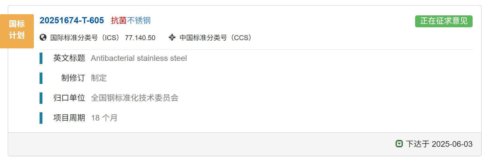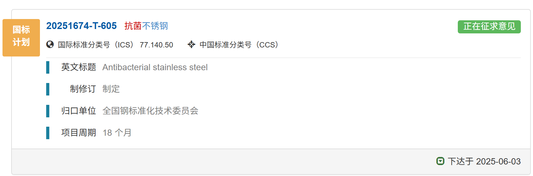 國(guó)家標(biāo)準(zhǔn)《抗菌不銹鋼》正在征求意見(jiàn)中,歡迎報(bào)名成為參編單位并提出修改意見(jiàn)和建議。01 國(guó)家標(biāo)準(zhǔn)計(jì)劃《抗菌不銹鋼》已下達(dá)國(guó)家標(biāo)準(zhǔn)計(jì)劃《